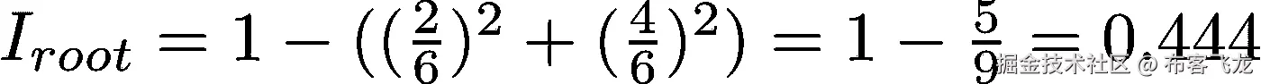 节点n的基尼不纯度是 1 减去所有类别J(对于二进制分类任务,这是 2)中每个类别p_i的样本分数的平方。这在文字上可能有点混乱,所以让我们算出根节点的 Gini 杂质。