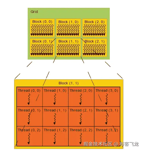 正如我们所讨论的,每个 GPU 核心都能够运行一个单独的线程。开始类比的最简单方法是假设矩阵的每个单元将由单个 GPU 核心来计算。由于所有内核都是并行运行的,因此所有单元都将被并行计算。因此,我们的时间复杂度突然下降到 O(n) 。现在,对于 2000 x 2000 矩阵我们只需要2000次运行,这对于计算机来说是相当容易计算的。通常我们之前讨论的每个线程都知道它的身份,也就是它所属的 块 和 网格 。或者更简单地说,矩阵的单元位置。此外,矩阵将被加载到 GPU 的共享内存中,我们可以通过索引直接访问单元数据并进行并行处理。简单对吗?让我们检查一下代码。
