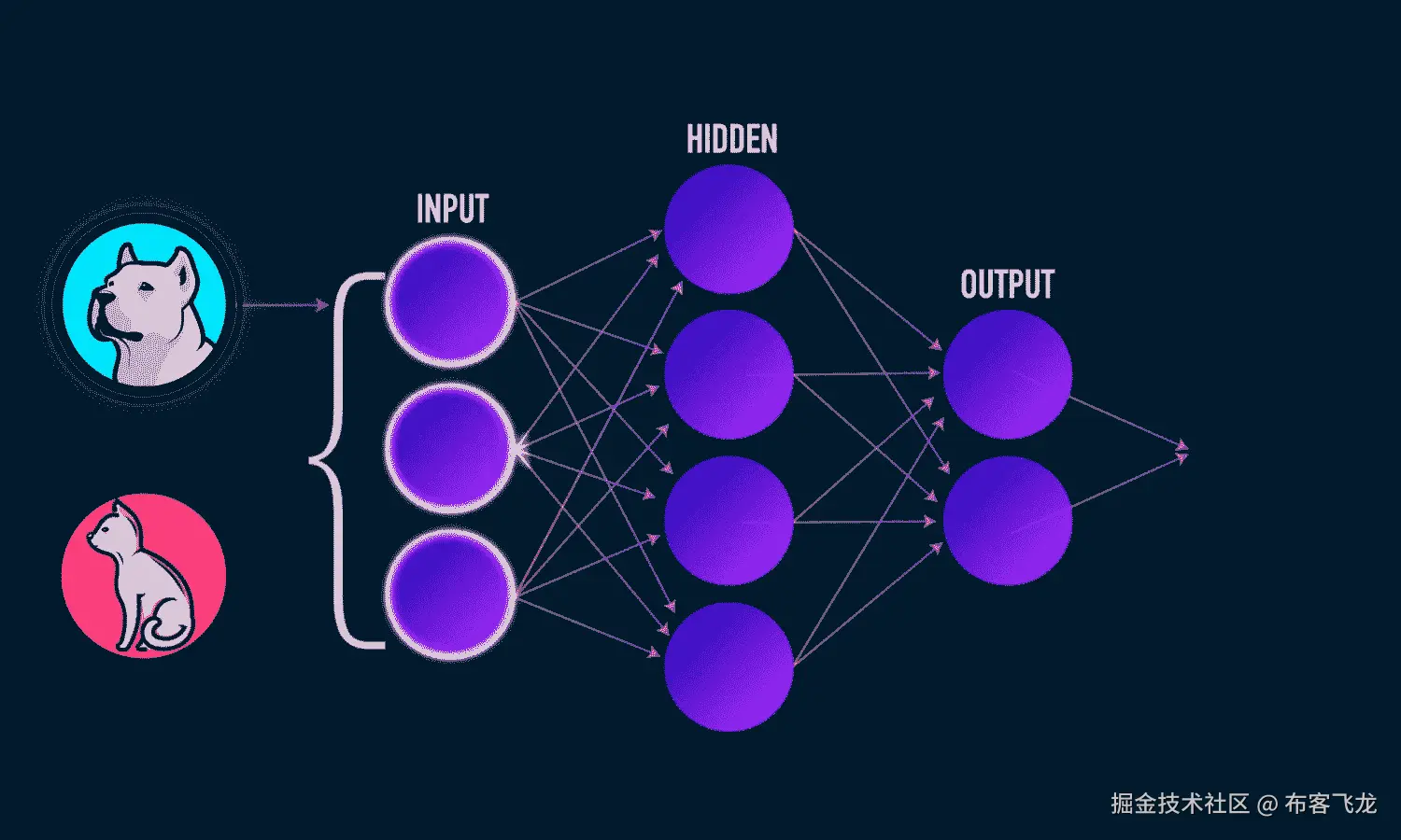 在训练过程中,我们为模型提供了特征和标签,因此它可以学习根据特征对点进行分类。(对于这个简单的问题,我们没有测试集,但在测试时,我们只给模型提供特征,并让它对标签进行预测。)