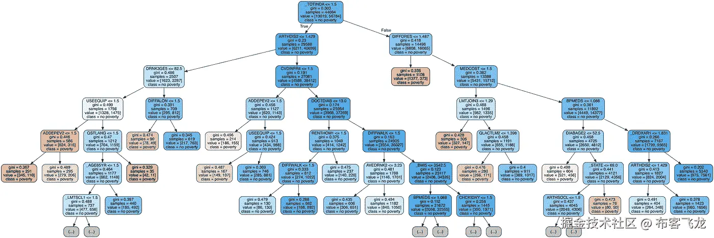 那么,当我们训练决策树时,实际上发生了什么呢?我发现理解决策树的一个有用的方法是可视化它,我们可以使用 Scikit-Learn 函数来实现(详情请查看笔记本或本文)。