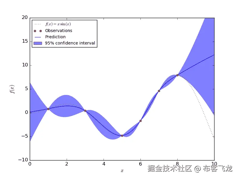 高斯过程能够通过明确地模拟标准偏差来量化不确定性。高斯过程的唯一缺点是它们不能很好地适应大型数据集。在下图中,您可以看到 GP 模型在包含大量数据的区域周围具有较小的置信区间(由标准差确定)。在数据点很少的区域,置信区间明显变大。
