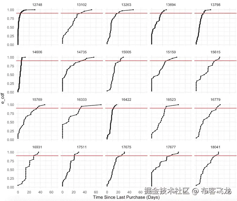 在计算了每个客户的 ECDF 后,我们将上述客户的 ECDF 可视化。红线代表大约 90%的百分比。因此,如果 ECDF 在 20 天内越过红线,这意味着 10 次中有 9 次顾客会在 20 天内再次购买。