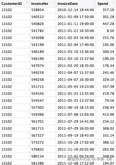 - CustomerID 13102 是一个不经常购买的客户,他(或她)的大部分购买间隔期为 5 到 30 天。