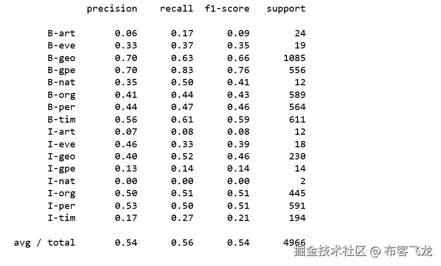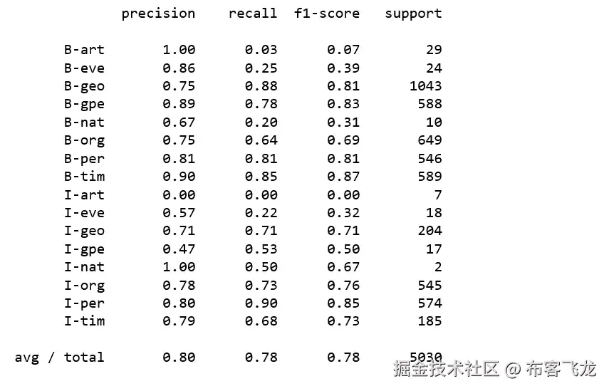 因为标签“O”(外部)是最常见的标签,它会使我们的结果看起来比实际好得多。因此,在评估分类指标时,我们删除了标签“O”。