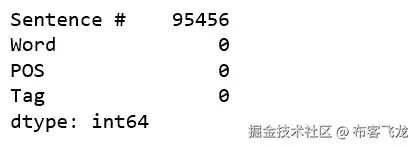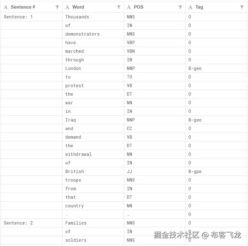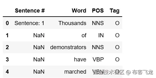 这些数据是特征工程语料库,标注有 IOB 和 POS 标签,可以在 Kaggle 找到。我们可以快速浏览一下前几行数据。
