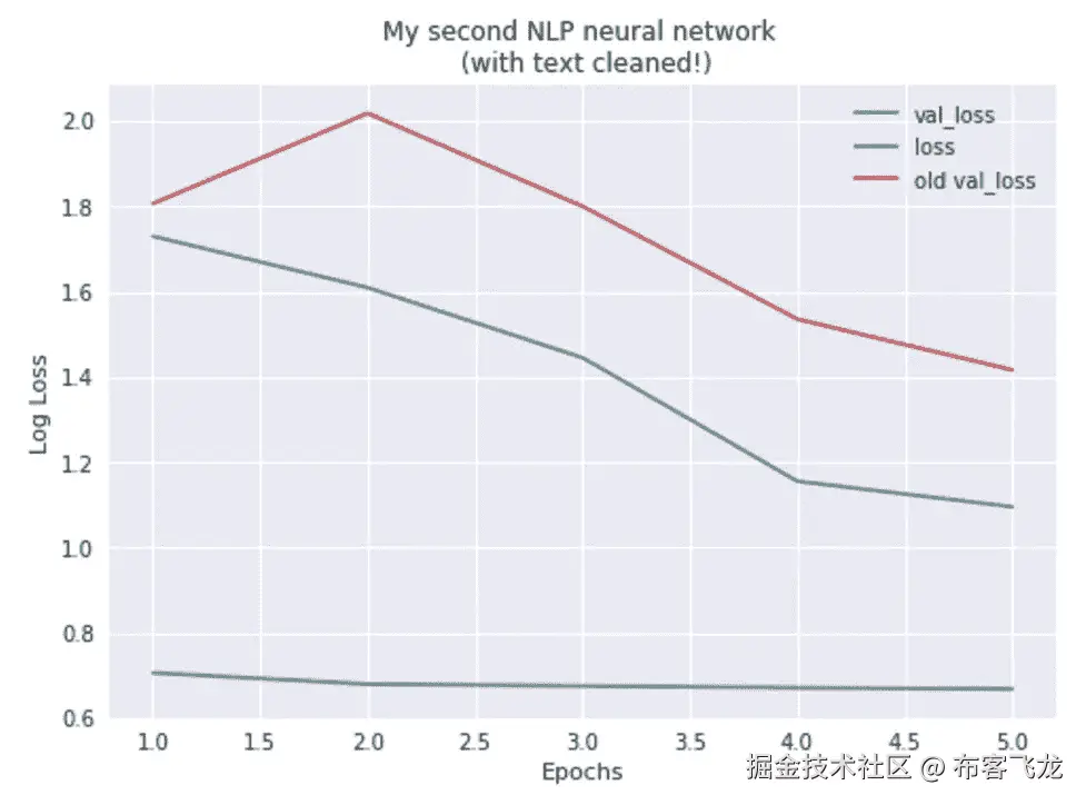 The output of my neural network with cleaned text. For comparison, the validation loss of the first network is plotted in red as ‘old val_loss’.