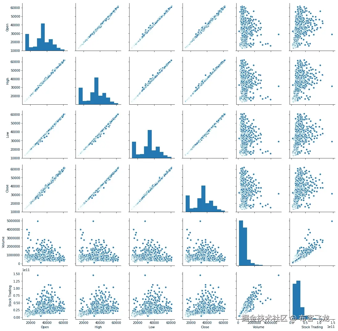 现在,我们可以从上面的图表中推断出,大部分的特征都是相互依赖相互关联的。“开放”与“高”、“低”和“关闭”高度相关。“交易量”在很大程度上与目标“股票交易”相关。因此,所有的特征对于分析都是重要的。
