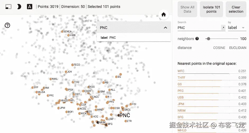 如果我们选择一只股票,PNC 银行,我们可以看到最近的邻居。