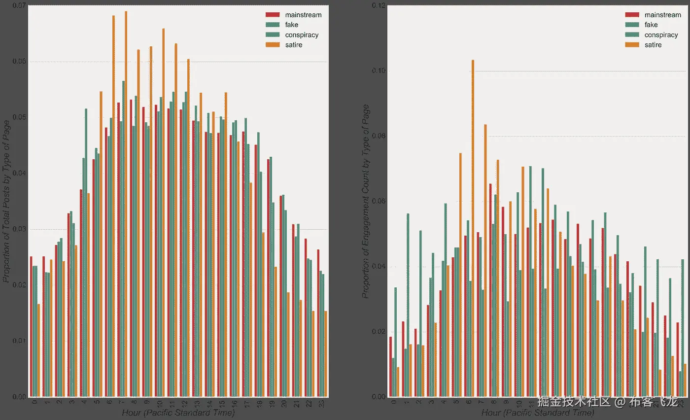 关于一天中的时间,当考虑到横跨美国 48 个州的四个时区时,无论新闻类型如何,帖子都在工作时间出现峰值(图 9)。不同类型的新闻在发布时间上的差异相对较小,讽刺新闻除外,它在早上 6 点到晚上 12 点(太平洋标准时间)之间出现了相当大的高峰。除了讽刺新闻之外,不同类型的新闻在一天的几个小时中的帖子模式几乎没有差异,与讽刺新闻的一天几个小时的模型系数相比,主流、虚假和阴谋新闻的一天几个小时的模型系数预计更接近于零。有趣的是,与发布时间相比,一天中的几个小时的参与水平似乎相对一致,这表明全球用户和/或美国深夜用户的广泛参与。相对于其他类型的新闻,阴谋网站的参与度似乎在所有时间都是最一致的,而讽刺页面的参与度在帖子最多的时候达到峰值,即早上 6 点到 7 点之间。