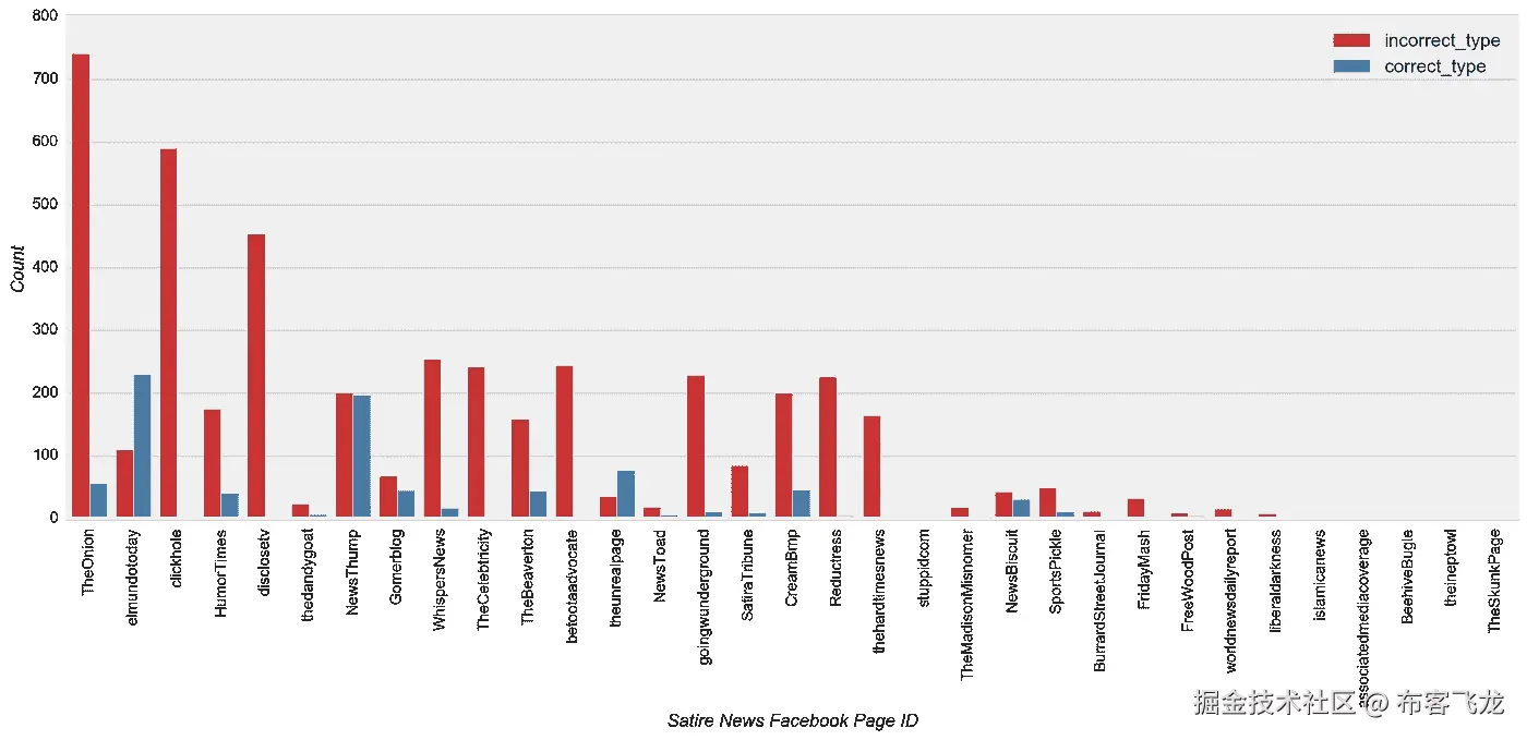 从页面级别的角度来看,当观察几乎所有高容量和低容量的阴谋和讽刺页面错误地预测正确预测数的数倍时,这些低召回率结果是明显的(图 16)。Fprnradio(阴谋)和 NewsThump(讽刺)是这种情况下的例外,不正确和正确的计数相对接近。Elmundotoday(讽刺)和 theunrealpage(讽刺)也是例外,正确的预测计数至少是错误计数的两倍。