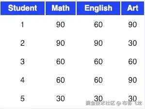 上表中的数据可以用矩阵 **A,**来表示,其中矩阵中的每一列显示测试分数,每一行显示学生的分数。