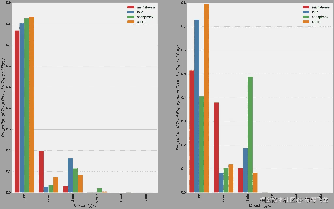 最终数据集包括来自 129 个脸书页面的超过 27.4 万篇帖子和超过 9 亿次参与活动。尽管数据集中主流站点的数量很少,但主流帖子是第二常见的帖子类型(图 1 和图 2)。