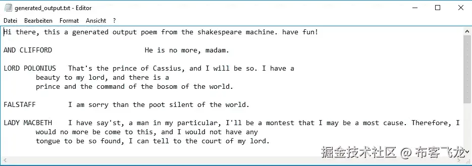 脚本 rnn_play.py 使用我们训练好的检查点生成一个新的“莎士比亚”剧本。你可以在终端和文件output_generated.txt中看到输出