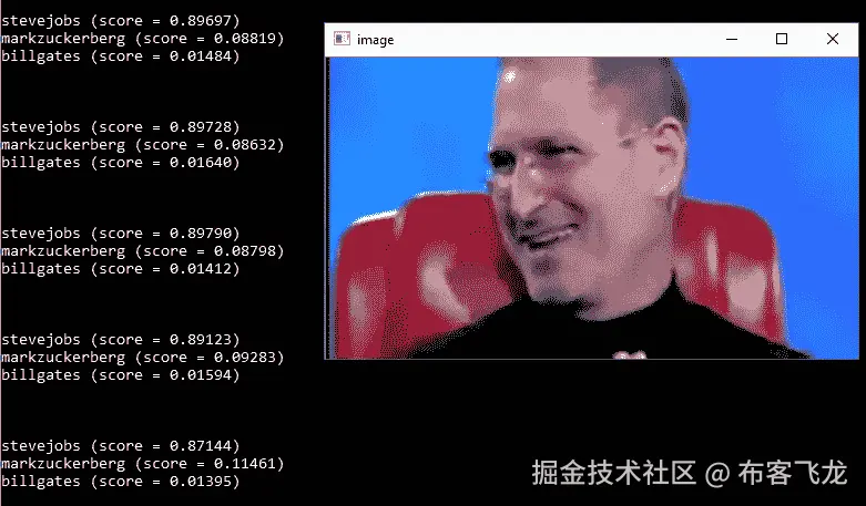 正如我们所看到的,模型实际上对他进行了正确的分类,尽管比尔·盖茨的头被切掉了一点。我们当然知道我们的模型现在确实适用于视频,但它也能识别史蒂夫·乔布斯吗?