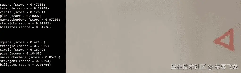 那么,我们来对一些框架进行分类。在命令行输入python classify.py math_own_old.mp4,看看你的模型是否能够识别正确的形状。