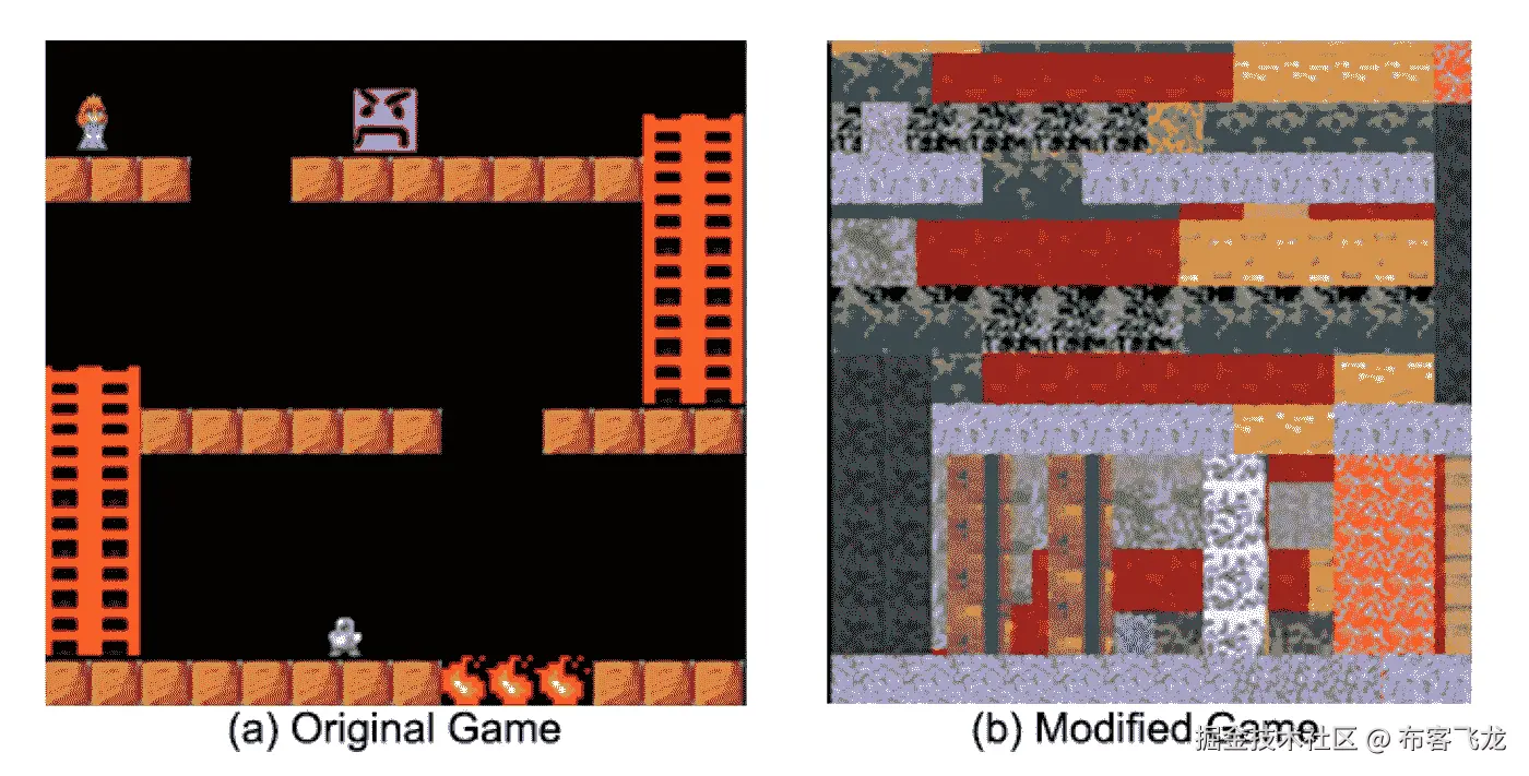 虽然他们的决策策略在表面上可能是相似的,但重要的是要记住,DQN 不像人类那样处理信息。它学习识别某些像素组是“好”还是“不好”。它避不了鬼,因为它连鬼是什么都不知道;它学会避免矩阵中的数字串,这些数字串与过去给它带来负面回报的数字串相似。一个人可以依靠过去的经验和外界的概念(“鬼是坏的,我应该跑”),DQN 什么都没有。最近的研究已经显示了这可以带来多大的优势,以及它可能是 RL 算法学习进度缓慢的一个重要原因。借用那篇论文中的一个图表,想象一下如果一个游戏看起来像这样,玩起来会有多困难: