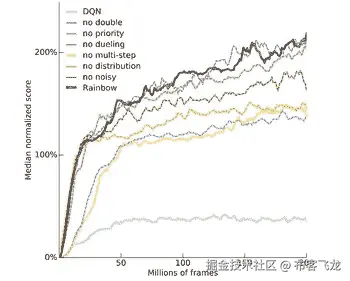 同样,这些变化最好的部分是我们可以将它们堆叠到同一个超级充电算法中,大概称为 NoisyNet N 步优先化双决斗深度 Q 网络,这真的很棒。去年年底,当 DeepMind 在此基础上增加了一个东西时,他们开始将其称为“彩虹”,要么是因为他们在整个名称堆叠问题上认输,要么是因为一群博士坐在会议室里看着这张图表上的颜色,在创造力上出现了不幸的失误: