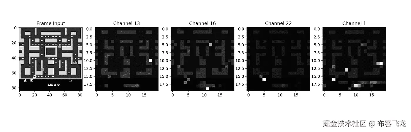 在这个例子中,通道 13 和 16 似乎跟踪单个幽灵,而通道 22 跟踪玩家,通道 1 一次看到多个精灵。该系统远非完美,因为似乎没有一个特征地图来拾取中心开始区附近的幽灵。这个幽灵很可能会在未来的一帧中被识别出来,而代理人在任何一集的成功似乎都与这些“盲点”持续的时间有关。