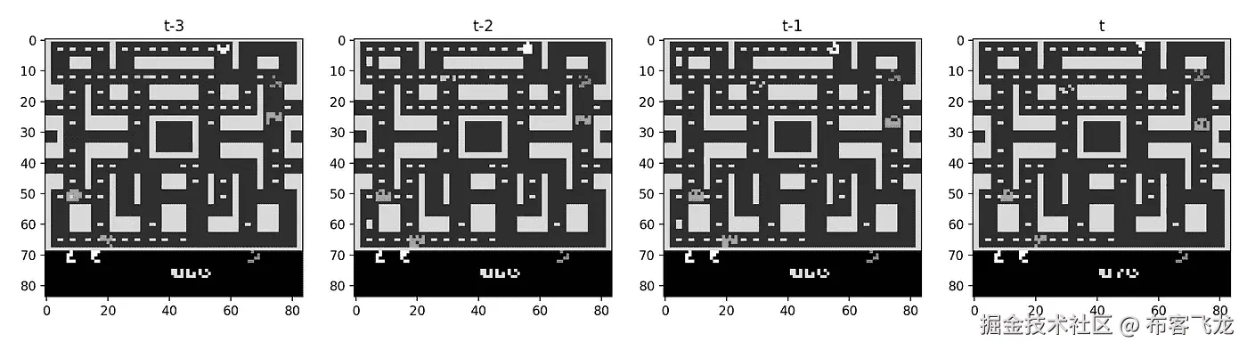 当然,这并不意味着我们丢弃了可能有用的颜色信息。例如,《吃豆人》中的每个彩色幽灵都有自己的人工智能,专业玩家可以利用这些差异来预测它们的去向,但我们的代理人不太可能区分它们。这样做是为了切断 RGB 图像的两个通道,从而大大减轻 CNN 的负担。还要注意,调整大小操作甚至设法删除了重影开始框左右两边的点的位置;幸运的是,这些通常是在吃豆人女士移动到迷宫的任何一边时偶然发现的。这些预处理步骤是 Atari RL 领域的一个非常标准的实践,所以我们决定在这里继续它们,即使它们没有针对这个特定的游戏进行优化。