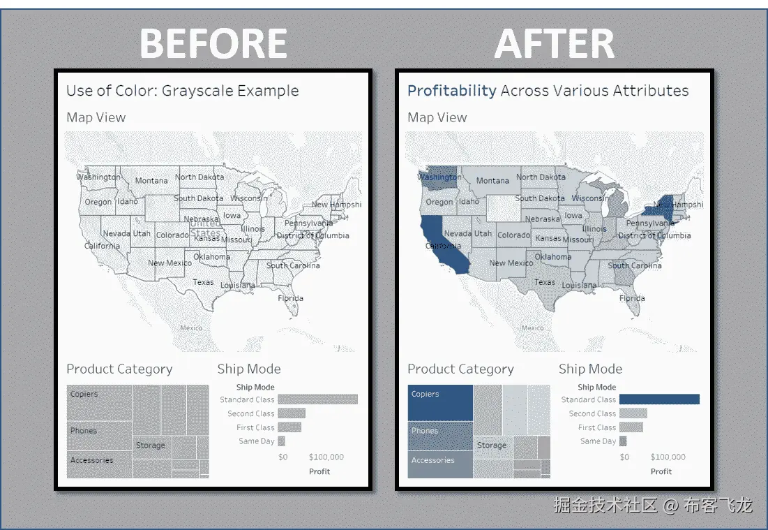 这是一个用颜色来讲述故事的小例子。你对色彩的运用有什么想法?下面是该仪表板的前后图像。
