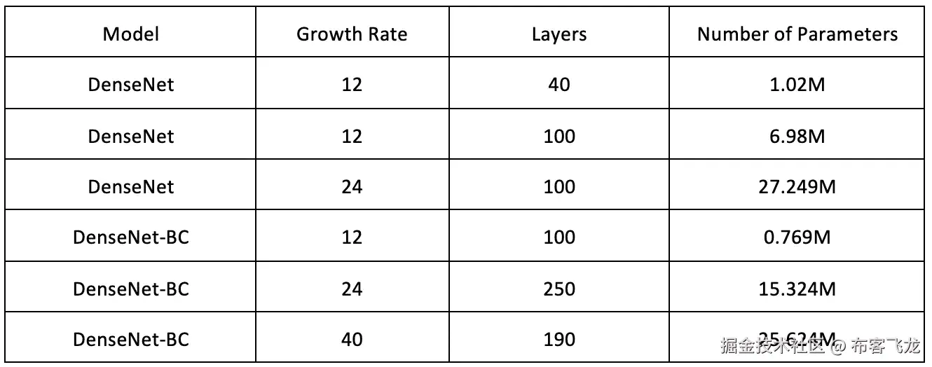 因此,对于 100 层 DenseNet-BC,每个 DenseBlock 将由 16 个密集层组成。由于我们将在“DenseNet-Layers-GrowthRate”之后调用 DenseNet,因此本文中涉及的 DenseNet 对应于 dense net-100–12。