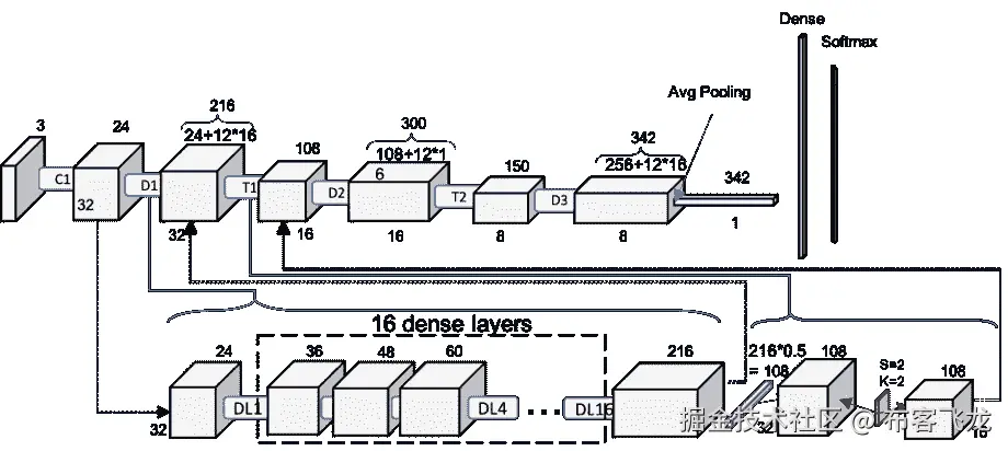可以检查每个密集层(DL)如何以 4 *过滤器数量的增长率执行 1x1 卷积。数字 4 是作者在论文中给出的,大多数知识库称之为 bn_size(瓶颈层数的乘法因子)。这个 1x1 卷积在 3x3 卷积之前应用线性变换,滤波器的数量是增长率。