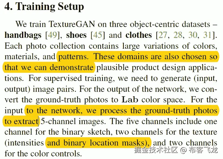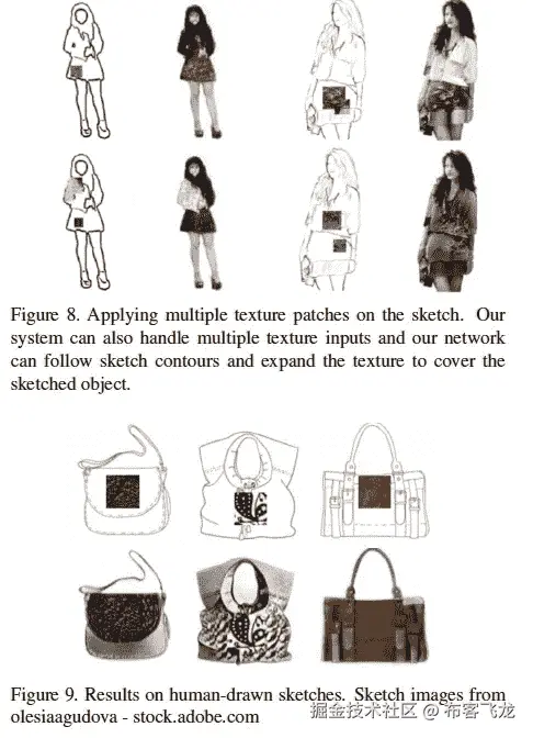 在这一节中,作者提出了纹理 GAN,一个条件生成网络,它能够从具有覆盖纹理的输入草图生成逼真的图像。他们的模型的一个优点是,用户可以直接将目标纹理片放在草图中。(关于这种 GAN 的一个令人印象深刻的事实是,它知道确切的边界,例如,点状纹理只能出现在裙子上,而不能出现在腿上。).注意作者使用了 LAB 色彩空间而不是 RGB 色彩空间,他们使用了“ Scribbler:用草图和颜色控制深度图像合成 ”中介绍的网络架构。
