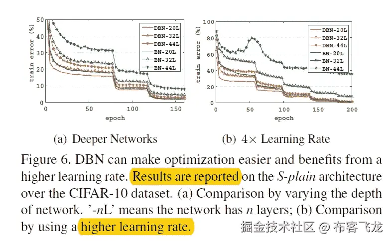 如上所述,当网络使用 DBN 而不是 BN 时,训练更加稳定。(更容易优化)。我们也可以更积极地设定学习率。