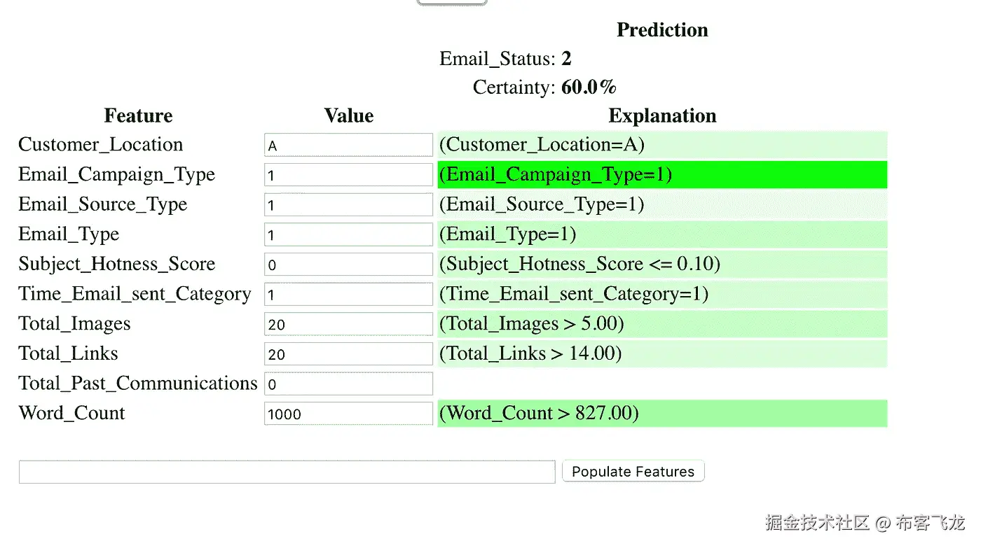 AuDaS 还提供了对预测的时间解释,让你了解每个特征对预测结果的贡献。一个简单的 web 应用程序展示了你如何与训练好的模型进行交互: