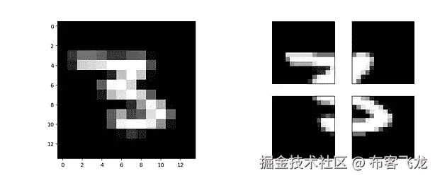 这就是我所做的,我取原始图像(2828),用(22)矩阵进行均值合并,得到(1414)的图像。我们将用它作为时间戳 1 的输入。对于其他时间戳的输入,我们将把原始(2828)图像切割成 4 个部分,并将其提供给网络。下面是实现这一点的代码。