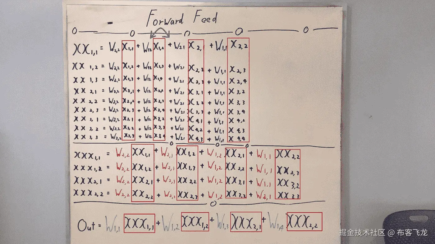 设红框为 22 输出图像 设绿框为 33 内核 设蓝框为 4*4 输入图像