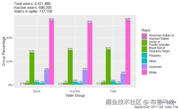 各组中白人占多数(斯派克占 54.7%;占非活跃选民总数的 52.5%;占总选民的 54.9%)。因为白人在总选民中占大多数,他们在高峰和非活跃选民总数中的代表性并不令人关注。对所有群体来说,这些百分比表明,在高峰和非活跃选民总数中的代表性是成比例的。为了扩展这个项目,我们可能会使用某种类型的分布测试来统计比较这些比例。