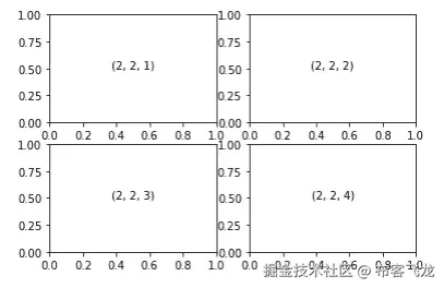 plt.text(0.5,0.5, str((2, 2, i)), ha=’center’, fontsize = 10)