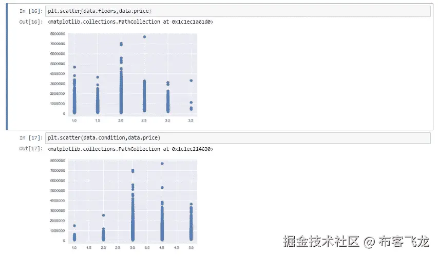 我们上面使用的图被称为散点图,散点图帮助我们看到我们的数据点是如何分散的,通常用于两个变量。从第一张图中我们可以看到,居住面积越大,价格越高。虽然数据都集中在某个特定的价格区域,但从图中我们可以看到,数据点似乎是在直线方向上。由于散点图,我们也可以看到一些不规则性,最高平方英尺的房子卖得很低,也许有另一个因素或可能数据一定是错误的。第二个数字告诉我们房子在经度上的位置,这给了我们一个非常有趣的观察结果,即-122.2 到-122.4 之间的房子售价更高。