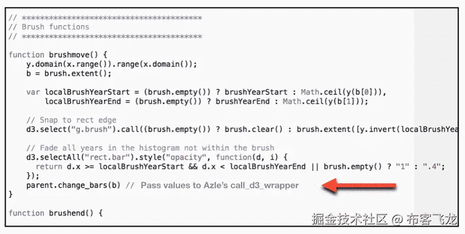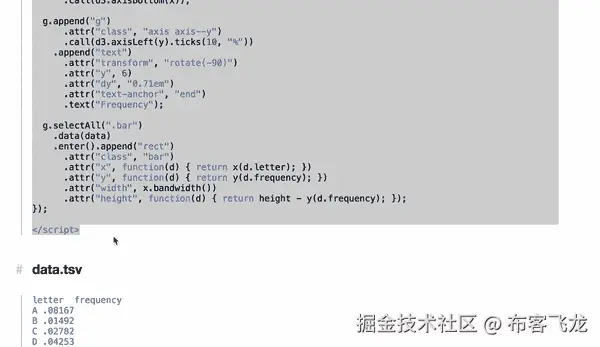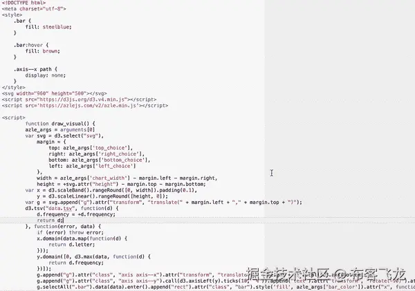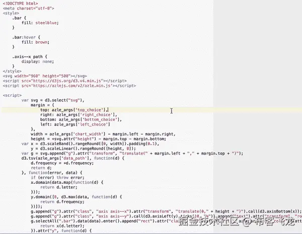 如果您对普通 JavaScript 和/或 jQuery 的语法更熟悉,您可以使用它们。任何脚本都可以传入 call_d3_extra 函数。下面是一个使用 jQuery 设计图表中条形样式的示例: