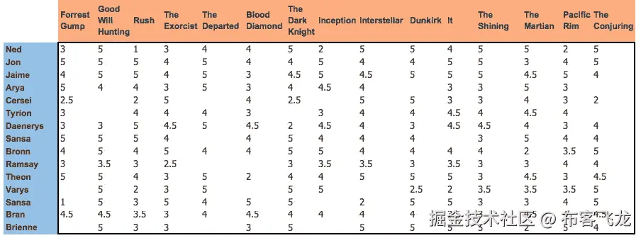 如图 2 所示,我们有不同用户对不同电影的评分数据,评分范围为 0-5。空白单元格表示用户尚未对电影进行评级。我们的目标是尽可能地模拟这个系统。