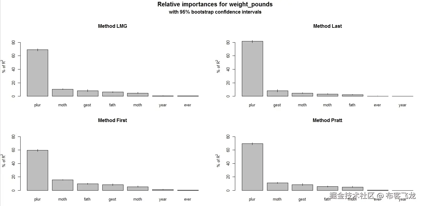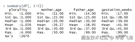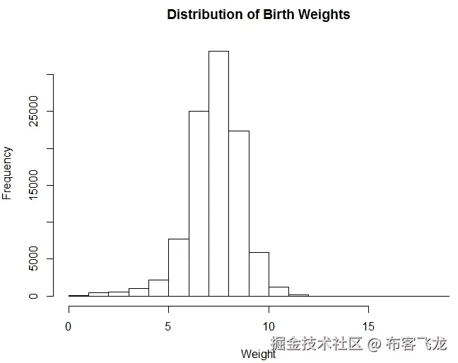 因为我们将结果作为熊猫数据帧返回,所以我们可以使用 hist 函数来绘制不同属性的分布。下图显示了出生体重和母亲年龄的分布。