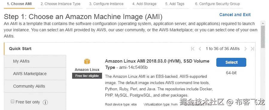 1.点击 的【启动实例】2。选择“亚马逊 Linux AMI 2018 . 03 . 0” 3。选择“t2.micro”,这是符合条件的自由层 4。点击 5【审核并启动】。点击“Launch ”,然后选择通过 SSH 连接的密钥 6。单击“启动实例”,然后单击“查看实例”