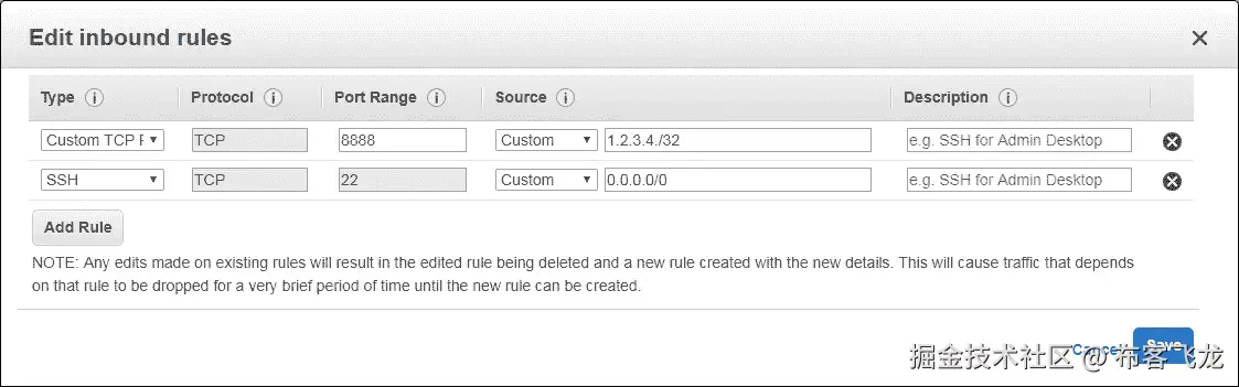 1.选择您的 EC2 实例 2。在“描述”下,选择安全性(如启动向导-1) 3。点击【操作】->-【编辑入站规则】 4。添加新规则:将端口改为 8888,在 source 下选择“我的 IP” 5。点击“保存”