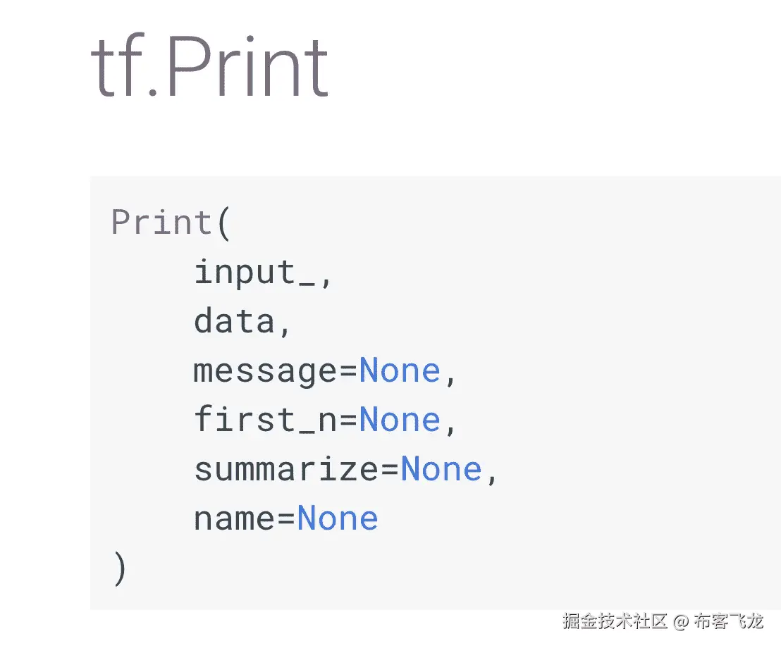 这在代码中的体现方式是将 Print 调用作为其第一个参数传递给作为其“输入”的节点,然后将返回值tf.Print赋给一个变量,该变量将作为图中后面节点的输入,从而将 Print 语句串行链接到操作流中。(实际使用这个返回的节点是至关重要的,因为如果不使用,它就会悬空。)