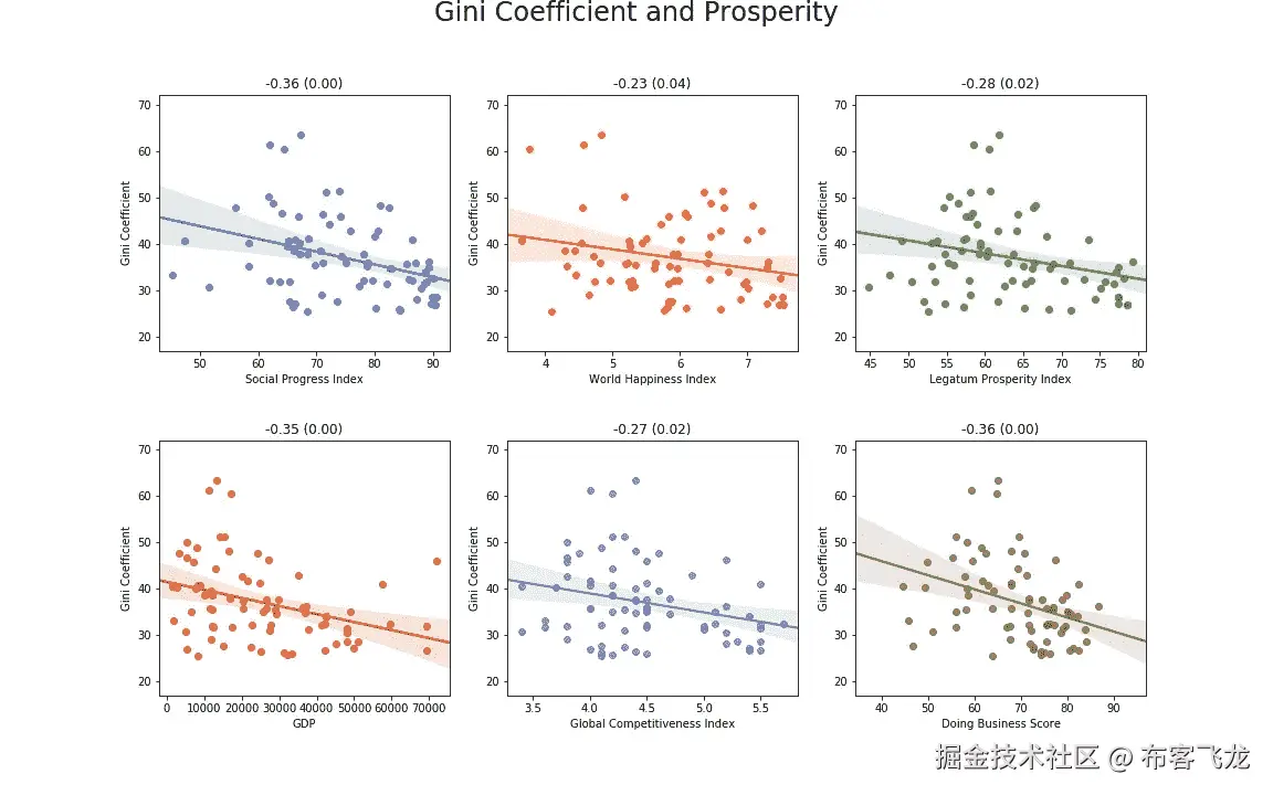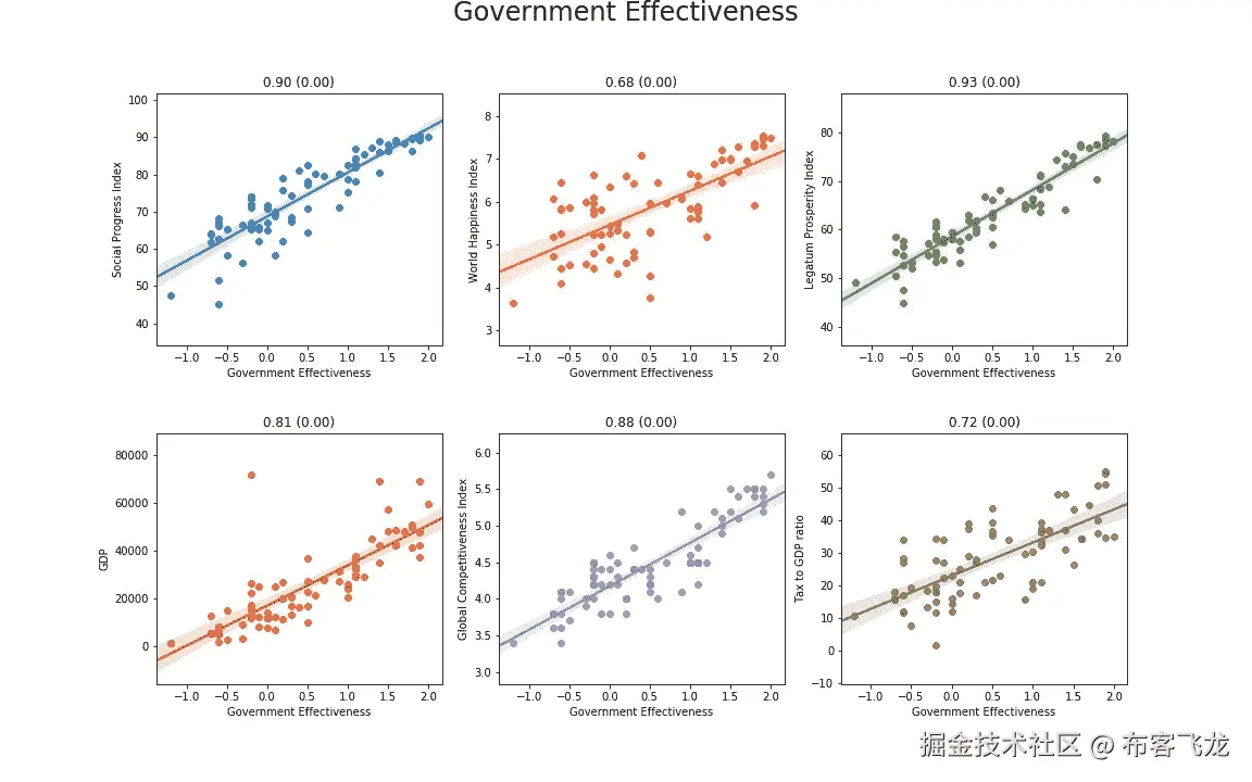 从上面可以看出,对社会和经济因素(如经商和社会进步指数)的影响很小(或者说影响的证据很少)。有趣的是,与全球竞争力指数之间存在微弱的正相关性,因此增税会损害企业的说法不一定正确。