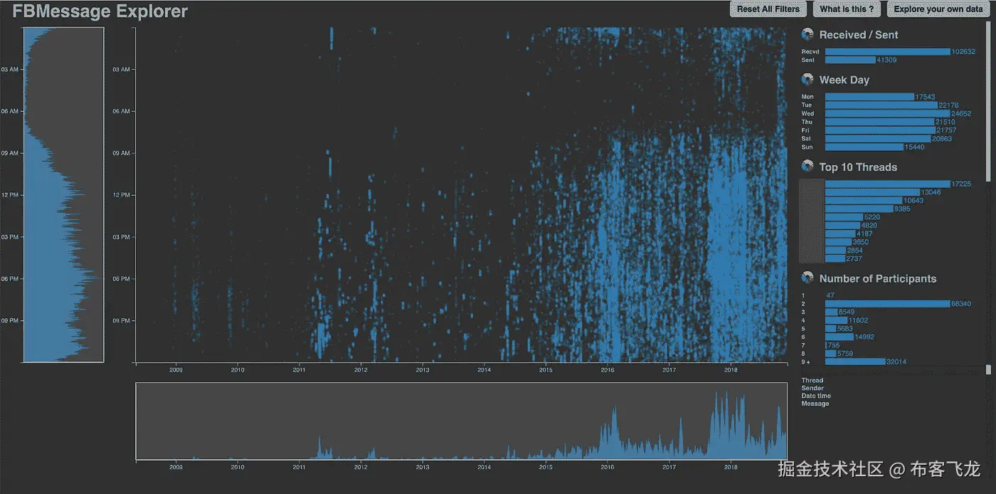 因此,当我在工程学院的最后一年不得不为 Dataviz 项目选择任何主题时,我抓住了这个机会:我和我的合作伙伴一起开发了一个工具,它可以让我了解我想要的关于我的短信习惯的一切,甚至更多。我们称它为 FBMessage Explorer ,好消息是,任何人都可以使用这个工具。我们试图让它尽可能地易于访问:不需要写一行代码,只需点击!