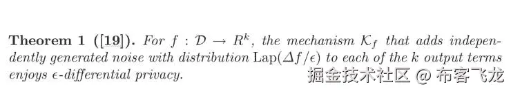 在查询函数 f 上,隐私机制 k 用 f(X)+(lap(δf/ε))^k 以分布 lap(δf/ε)添加噪声)独立地响应 f(x)的 k 个分量中的每一个。