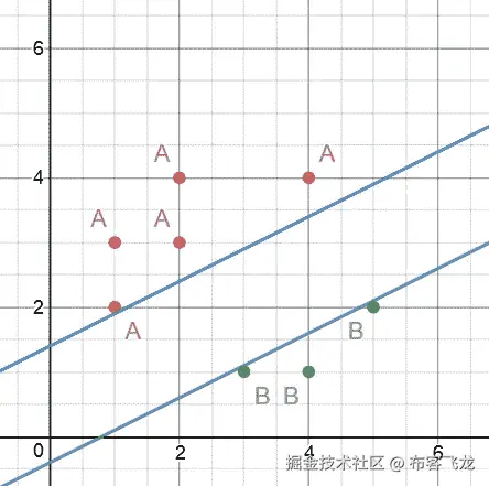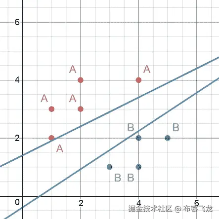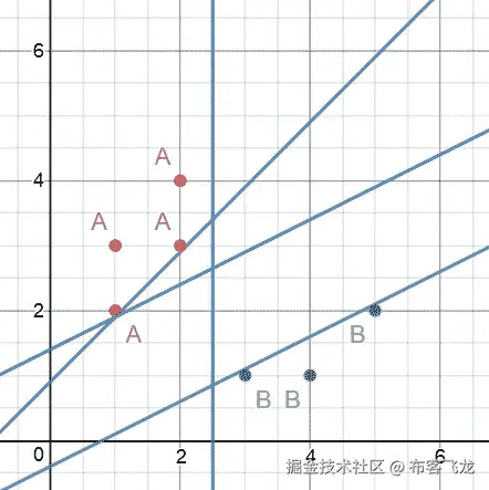 如果我们试图用直线来区分这两类,理论上可能会有无限可能的直线: