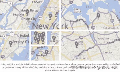- 微软应用 DP 来掩盖个人在其地理位置数据库中的位置;这种方法包括随机删除、添加和打乱单个数据点。其实现的一个新颖方面是创建了 PrivTree ,在给定原始数据和一些其他参数(要使用的拉普拉斯噪声的比例、用于决定是否应该发生节点分裂的阈值等)的情况下。),可以实现差分私有算法,并为几乎任何种类的位置数据输出噪声数据。