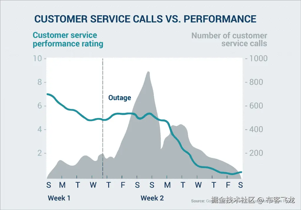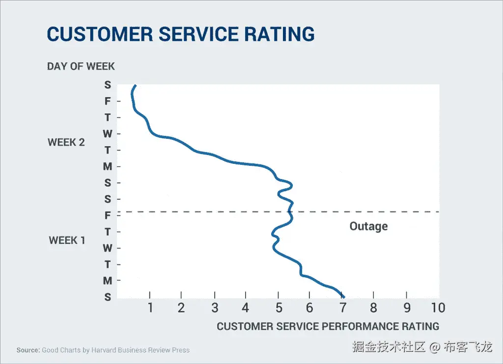 例如,假设您想要揭示即使在停机后性能评级仍持续下降,那么观众必须努力找到这一趋势,因为背景中的峰值会分散对绿线的注意力。