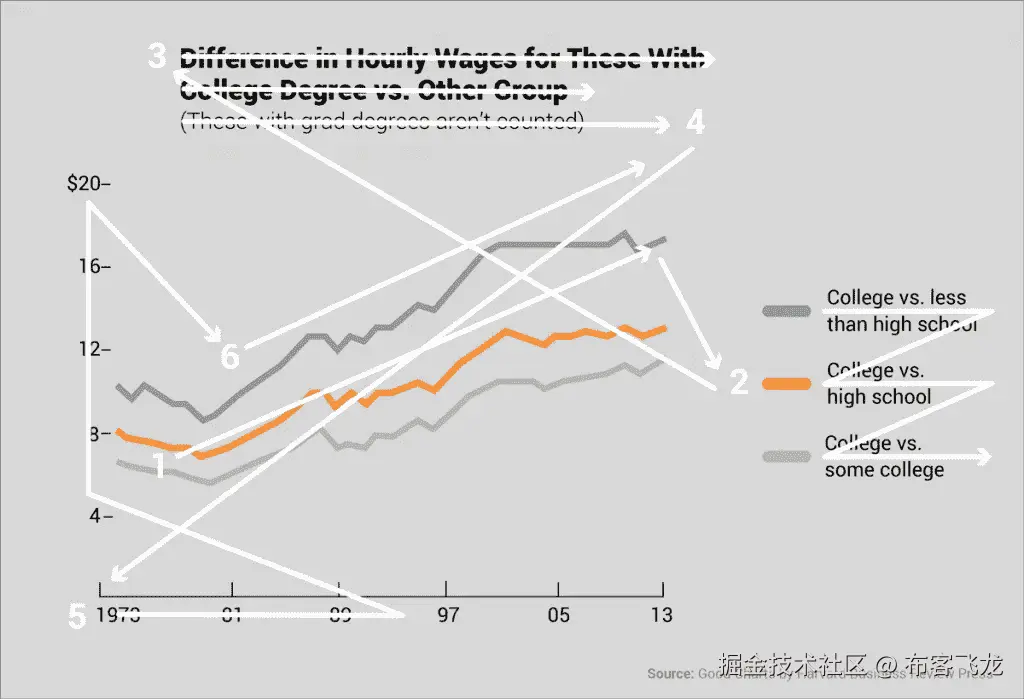 阅读有文字的页面和阅读图表的第一个区别是,在西方文化中,你阅读的顺序是从左到右,从上到下。对于第二种,没有预先确定的顺序——你只是去你的眼睛带你去的地方。