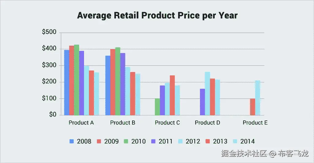 在这张图表中,我们的眼睛立即被蓝色条、灰色线和代表平均价格点的蓝点所吸引。