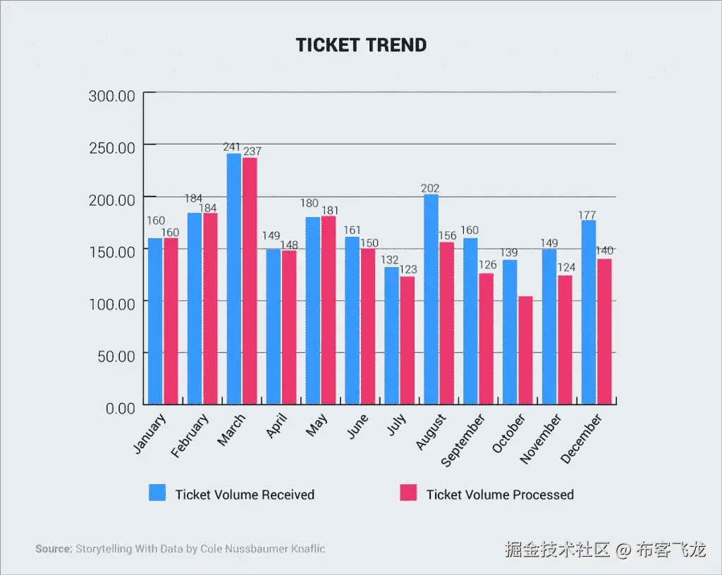 此条形图显示了一年中收到和处理的票证数量。