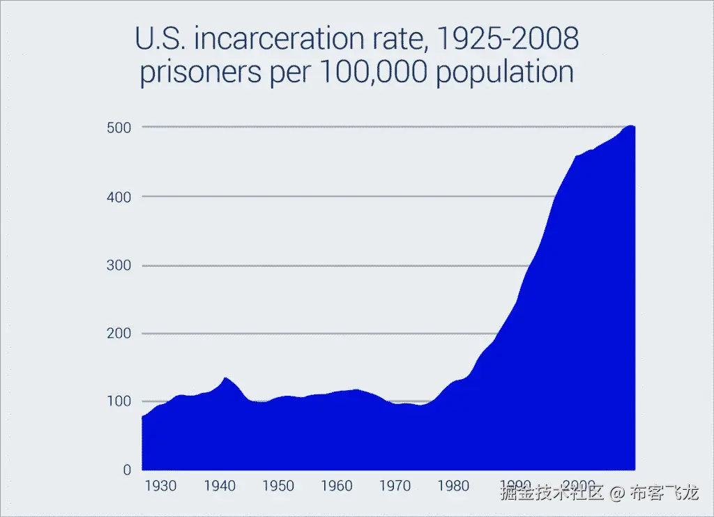 图表中最突出的是最右边的峰值。这幅图的中心信息非常清楚:自 20 世纪 70 年代以来,美国的监禁率呈指数增长。